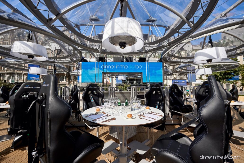 Dinner in the sky 2.0 is een uniek, wereldwijd concept waarbij u uw gasten laat genieten van overheerlijke gerechten op hoogstaand niveau. Met een oogstrelend uitzicht van op 50 meter hoogte zal u een ongekend culinair hoogtepunt ervaren! Het volledige platform biedt maar liefst plaats aan 32 personen, verdeeld over acht eilanden van 4 personen.