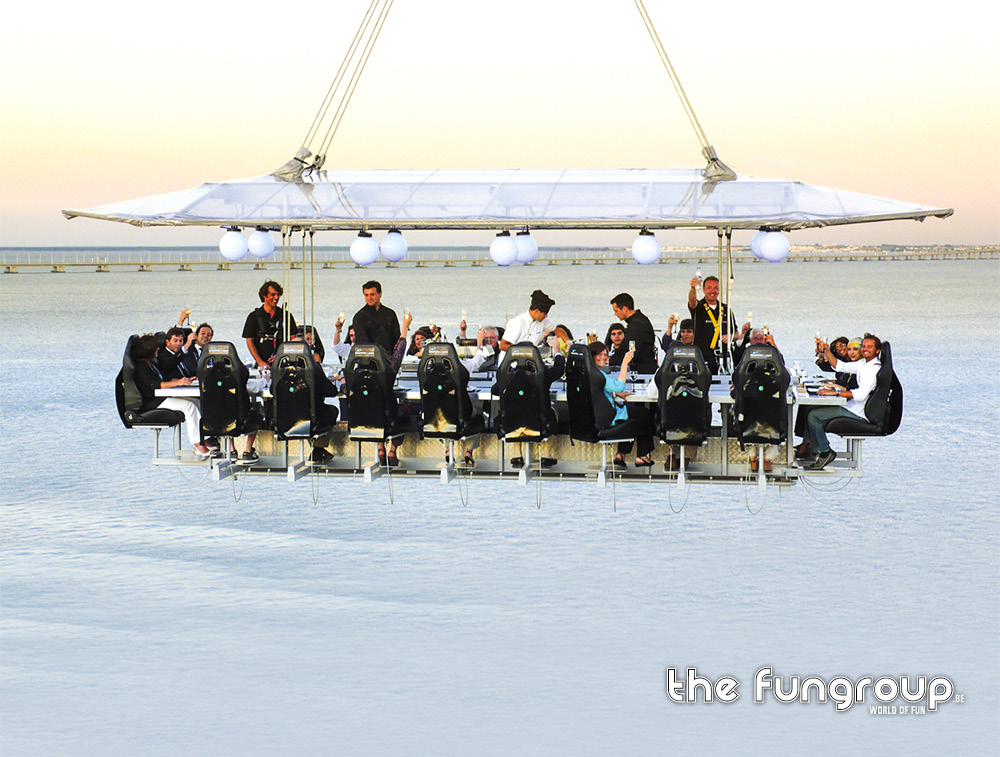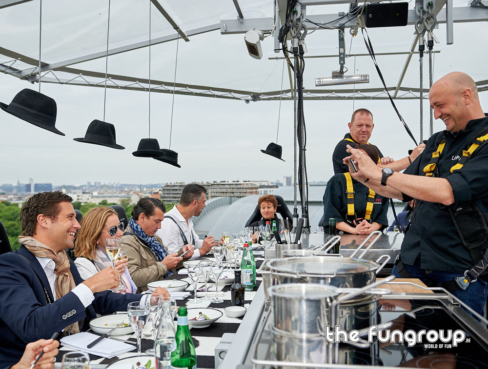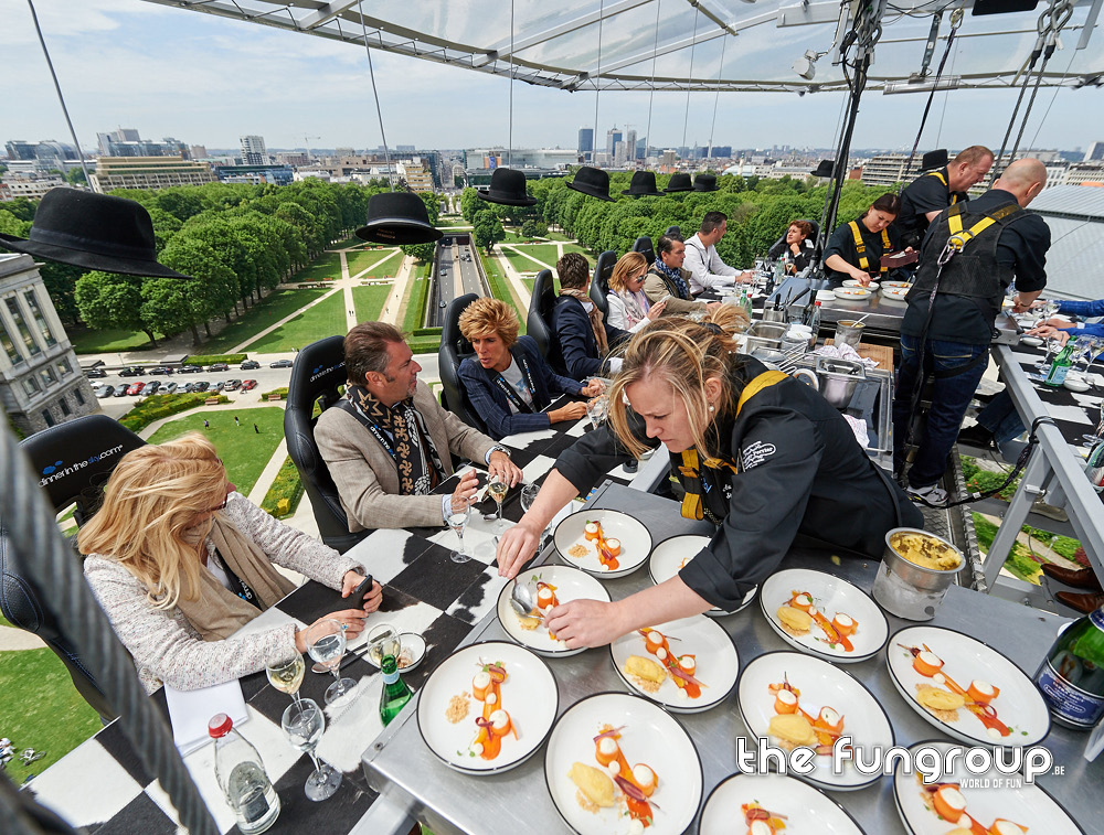 Het wereldwijde concept Dinner in the Sky is een unieke ervaring waarbij 22 personen op 50m hoogte kunnen genieten van een diner bereid door de (sterren)chef van dienst en ondertussen genieten van een spectaculair uitzicht op de omgeving! Dit is een op-en-top Belgisch product, actief in meer dan 60 landen wereldwijd!