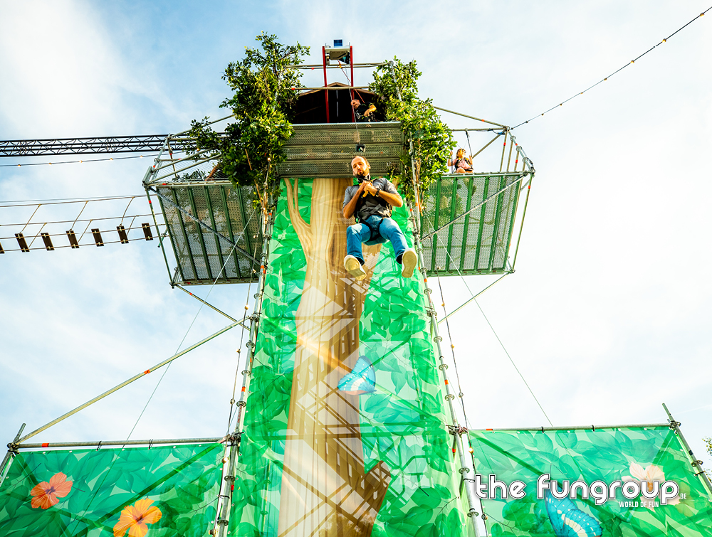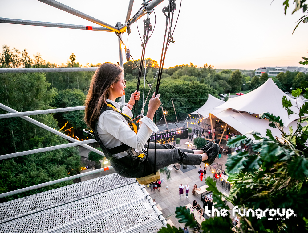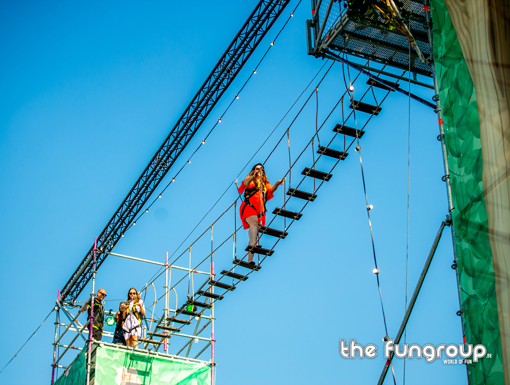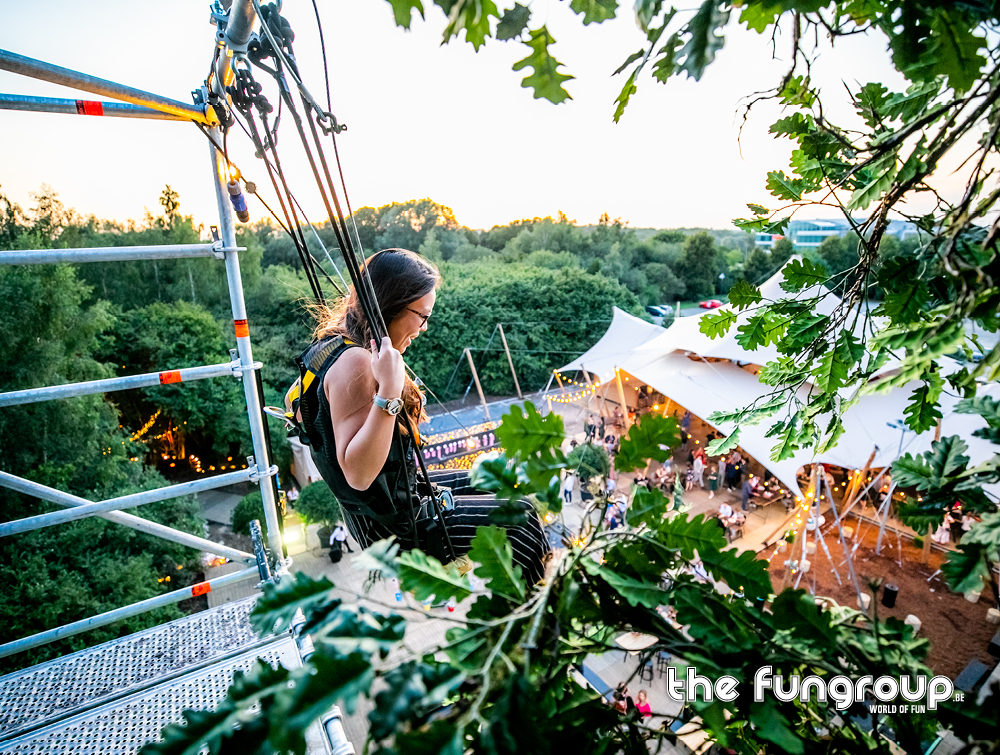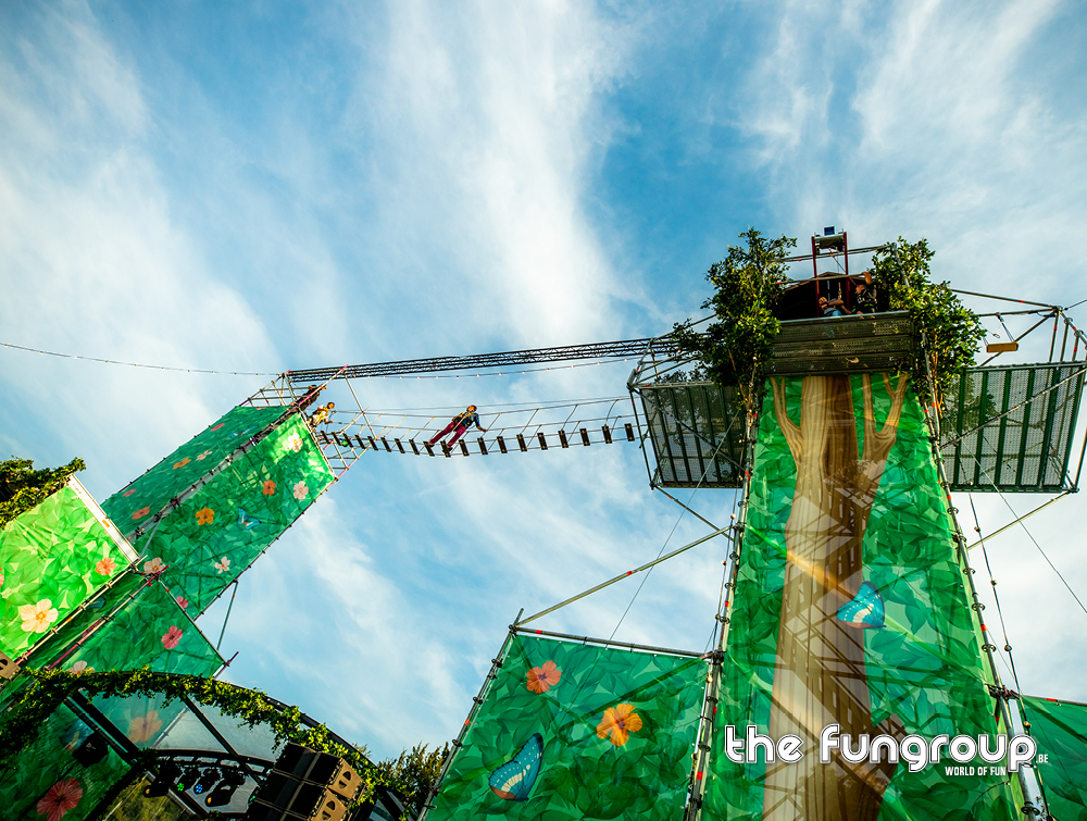 Mag het wat meer zijn dan een eenvoudig podium op jouw evenement? Het Interactief podium is een gloednieuw concept dat jouw podium aan de hand van een Layher constructie ombouwt tot een totaalbeleving met tal van waanzinnige attracties. Via trappen klim je naar boven om vervolgens via een loopbrug over het podium heen te wandelen. Verderop schommel je met een schitterend uitzicht over de hele site. Het avontuur eindigt met een sprong van de 16 meter hoge toren waarbij je een vrije val gevoel ervaart door het speciaal ontwikkelde valsysteem.
