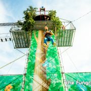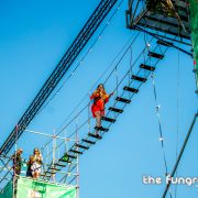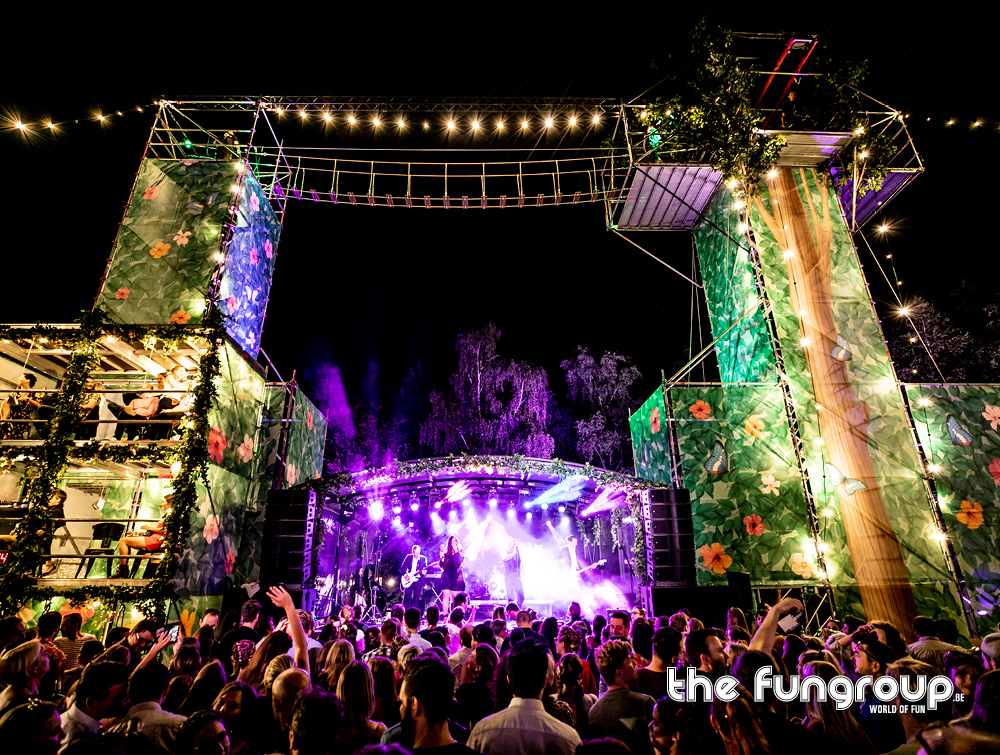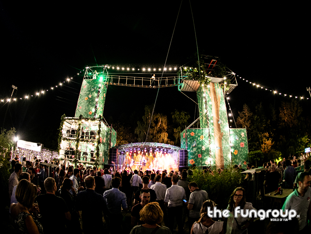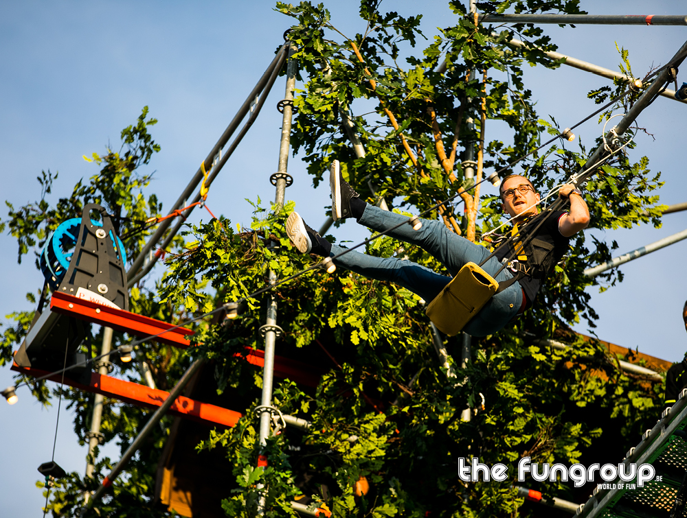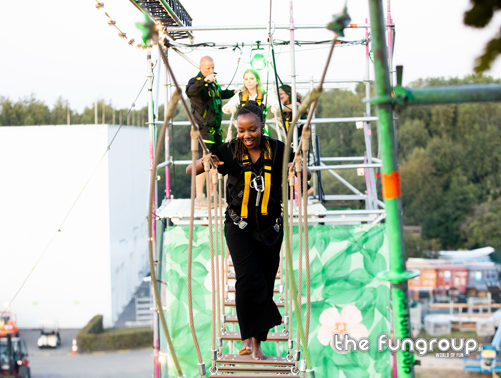 Mag het wat meer zijn dan een eenvoudig podium op jouw evenement? Het Interactief podium is een gloednieuw concept dat jouw podium aan de hand van een Layher constructie ombouwt tot een totaalbeleving met tal van waanzinnige attracties. Via trappen klim je naar boven om vervolgens via een loopbrug over het podium heen te wandelen. Verderop schommel je met een schitterend uitzicht over de hele site. Het avontuur eindigt met een sprong van de 16 meter hoge toren waarbij je een vrije val gevoel ervaart door het speciaal ontwikkelde valsysteem.