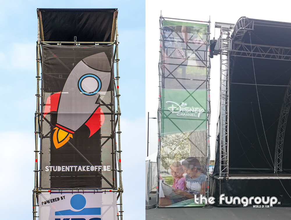 Deze Layher Side-Wings zijn dé oplossing voor het ophangen van het geluid. Ze worden opgebouwd uit klassieke layherconstructie waardoor er een heftruck aanwezig dient te zijn. Deze Side-Wings kunnen perfect gepersonaliseerd worden door middel van banners.
