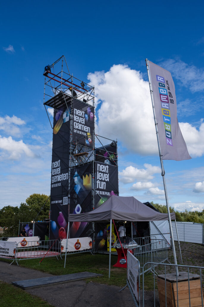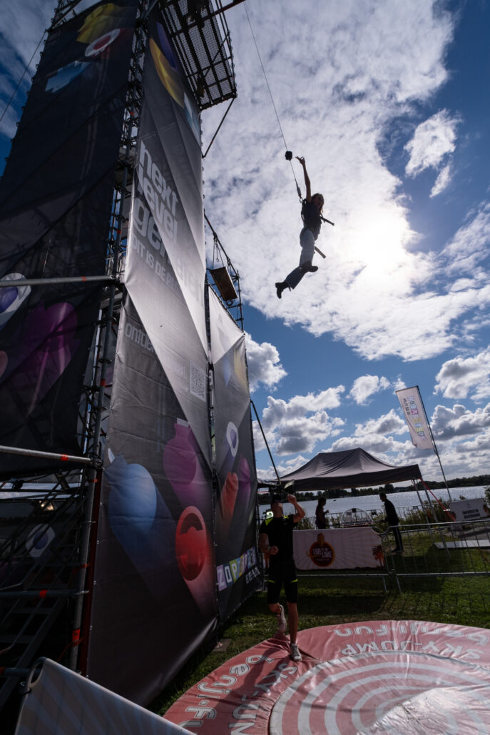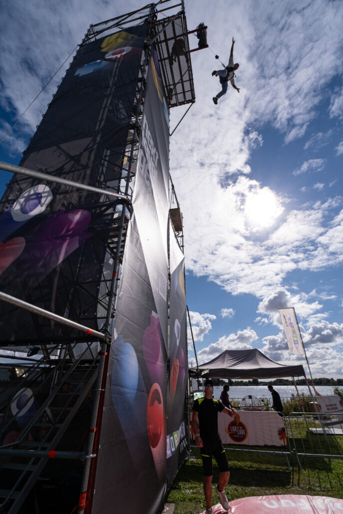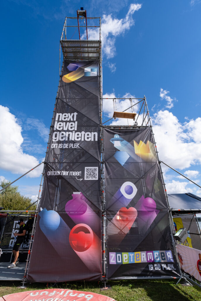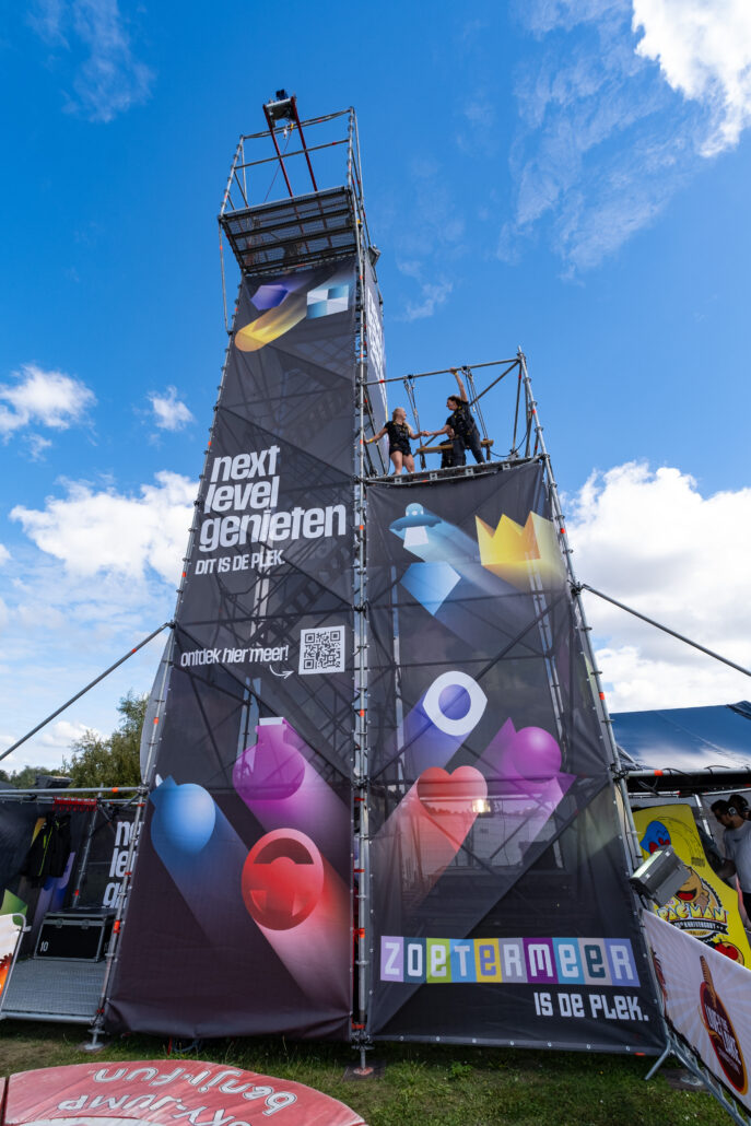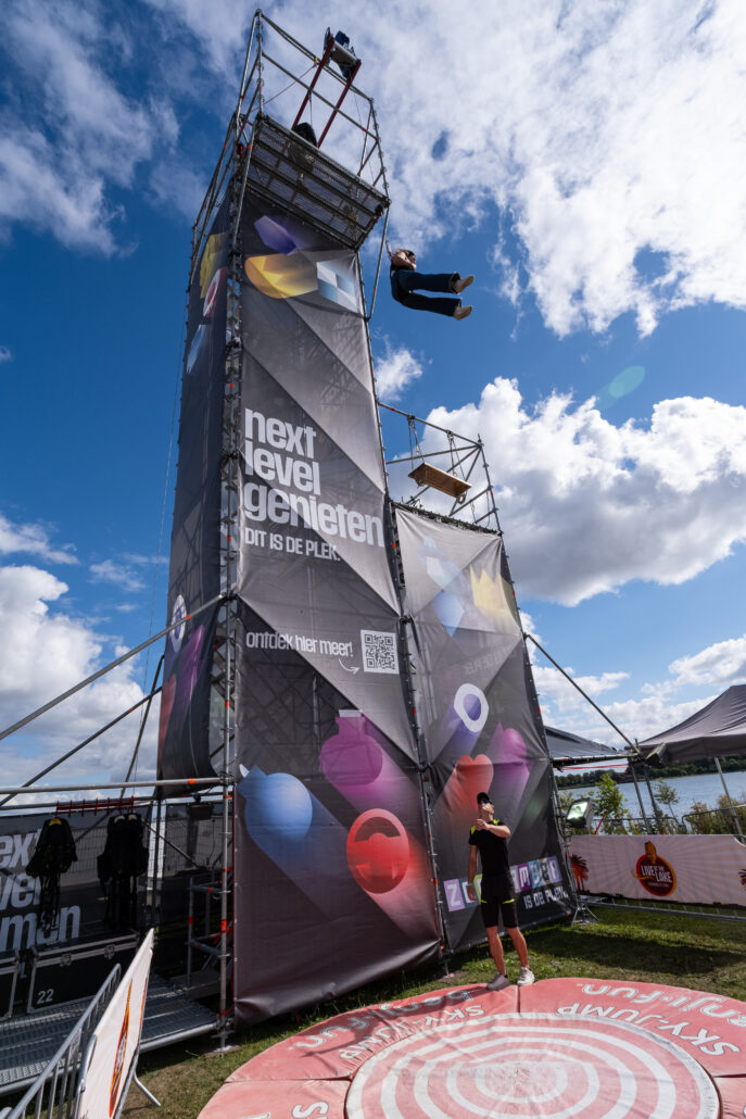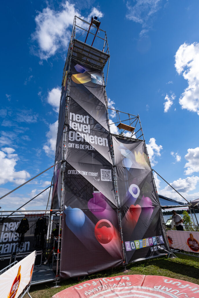 Durf jij de sprong te wagen? Deze toren is dé ultieme blikvanger voor jouw evenement – gegarandeerde sensatie én volledig personaliseerbaar met banners. Dankzij een innovatief valsysteem kunnen bezoekers van maar liefst 16 meter hoogte naar beneden springen. De stevige Layher-constructie is uitgerust met een efficiënt trappensysteem, zodat deelnemers snel en veilig naar boven kunnen.